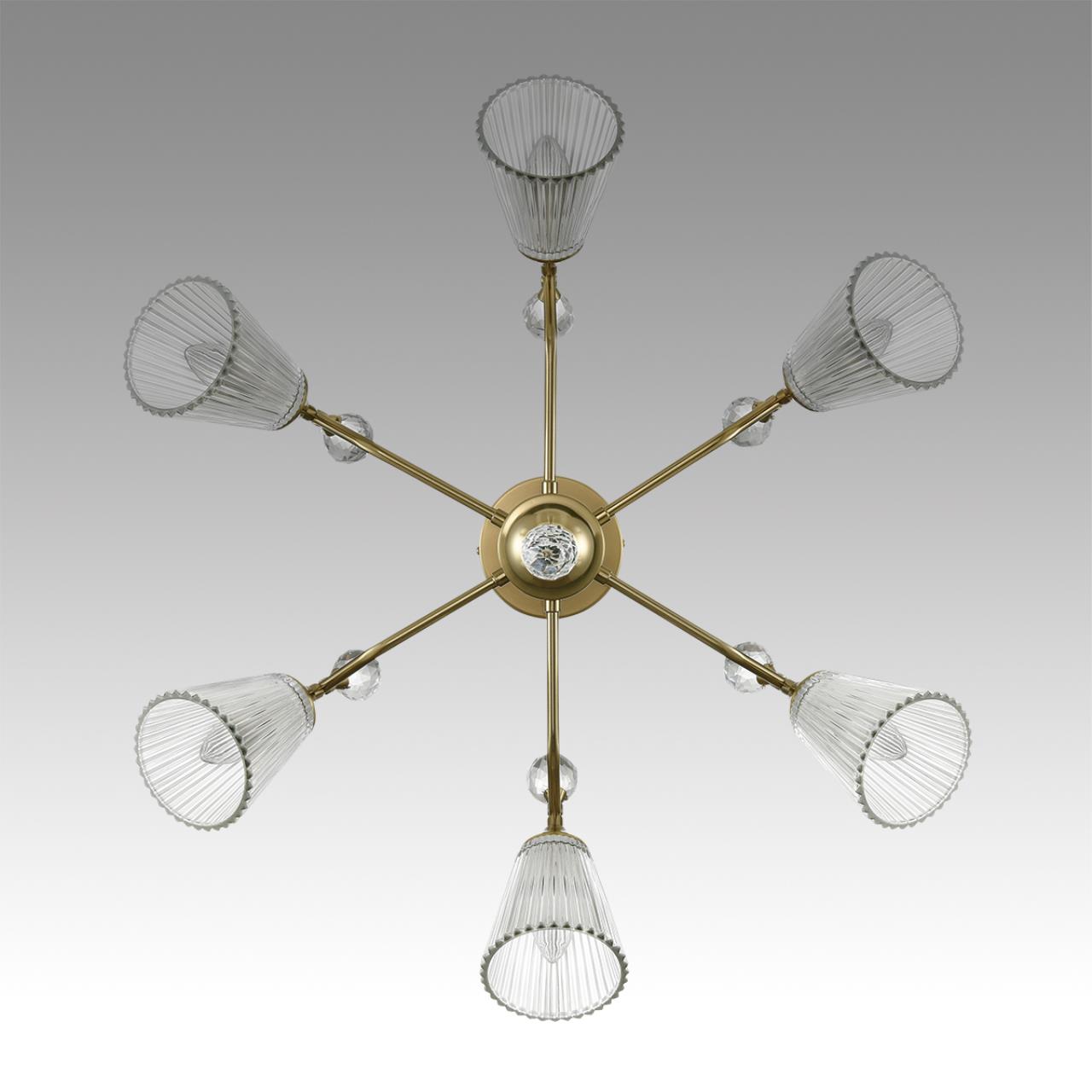 Классическая серия AURICA — это крупные стеклянные плафоны и основание цвета латунь. Изюминка этой люстры — большие хрустальные шарики, которые венчают рожки, добавляя блеска и лоска в интерьер. Прозрачные граненые плафоны изготовлены из толстого стекла с отличными оптическими свойствами, что в целом усиливает сияние светильника.