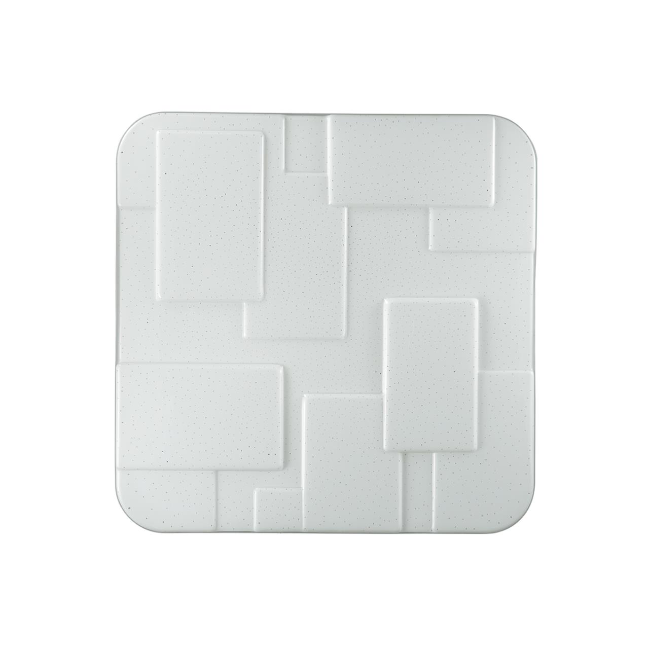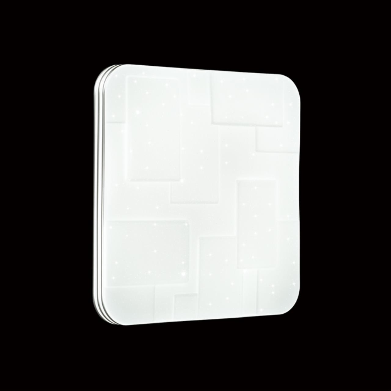 Светильник 2085/DL линии NORES состоит из металлического основания (базы) и пластикового рассеивателя. Материал рассеивателя — высококачественный акрил белого матового цвета, обеспечивающий светильнику равномерное рассеивание и хорошее светопропускание. Форма плафона: квадратная, в виде рельефного орнамента с геометрическим рисунком, декорирован прозрачными точками, придающими включенному светильнику красивый эффект «звездного мерцания» и переливания. Степень защиты IP43 позволяет использовать светильник в определенных зонах влажных помещений. В комплект входит заменяемый LED модуль с линзами, мощностью 48Вт, которая соответствует лампе накаливания 430Вт. А также пульт ДУ, с помощью которого осуществляется плавное изменение цветовой температуры 3000-6300К, изменение яркости, переход в режим переключения теплого/белого/холодного/ночного света. Светильник имеет функцию «память».