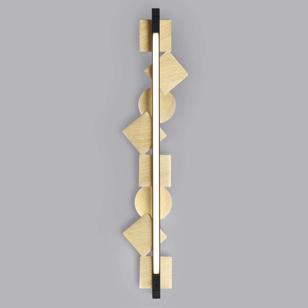 Настенные светильники GEOS —это новый взгляд на настенное освещение. В светильниках используется две фактуры: брашированная бронза и новый фактурный черный — «ice crack», который помимо эффектного брутального вида придает пластинам дополнительные антикорозийные свойства. Источник света можно поворачивать на 360°, благодаря чему светильник может использоваться как для отраженного света, так и для направленного. Теперь с высотой 570мм.
