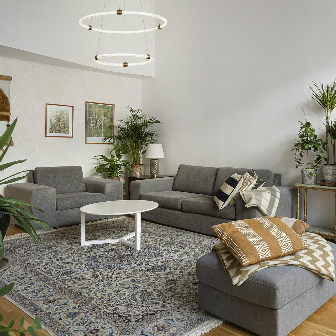 Витые кольца подвеса TWINKLE хороши как во включенном, так выключенном виде. Красивый перламутровый акрил снаружи ровный и гладкий, а внутри имеет спиральную насечку. Кольца, словно ювелирное украшение в золотой оправе, станут не только источником яркого света, но восхищенных взглядов. Высоту и уровень подвесов можно регулировать, создавая оригинальную композицию. В том числе можно смело размещать на потолках с различным уклоном, компенсируя разный уровень длиной струн.