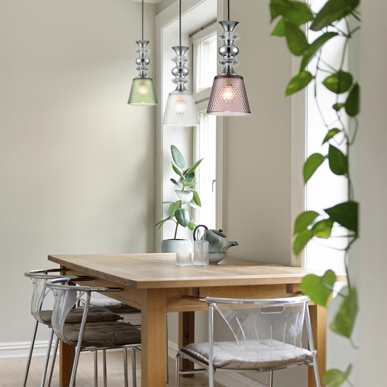 Серия соло-подвесов MANOLA подходит для помещений в классическом стиле. Сложное наборное основание из прозрачных и хромовых элементов украшает светильник. Цветное стекло плафона имеет гладкую наружную поверхность и ребристую внутри. Актуальная цветовая гамма — зеленый, розовый, прозрачный — позволяет добавить цветового акцента в интерьер.