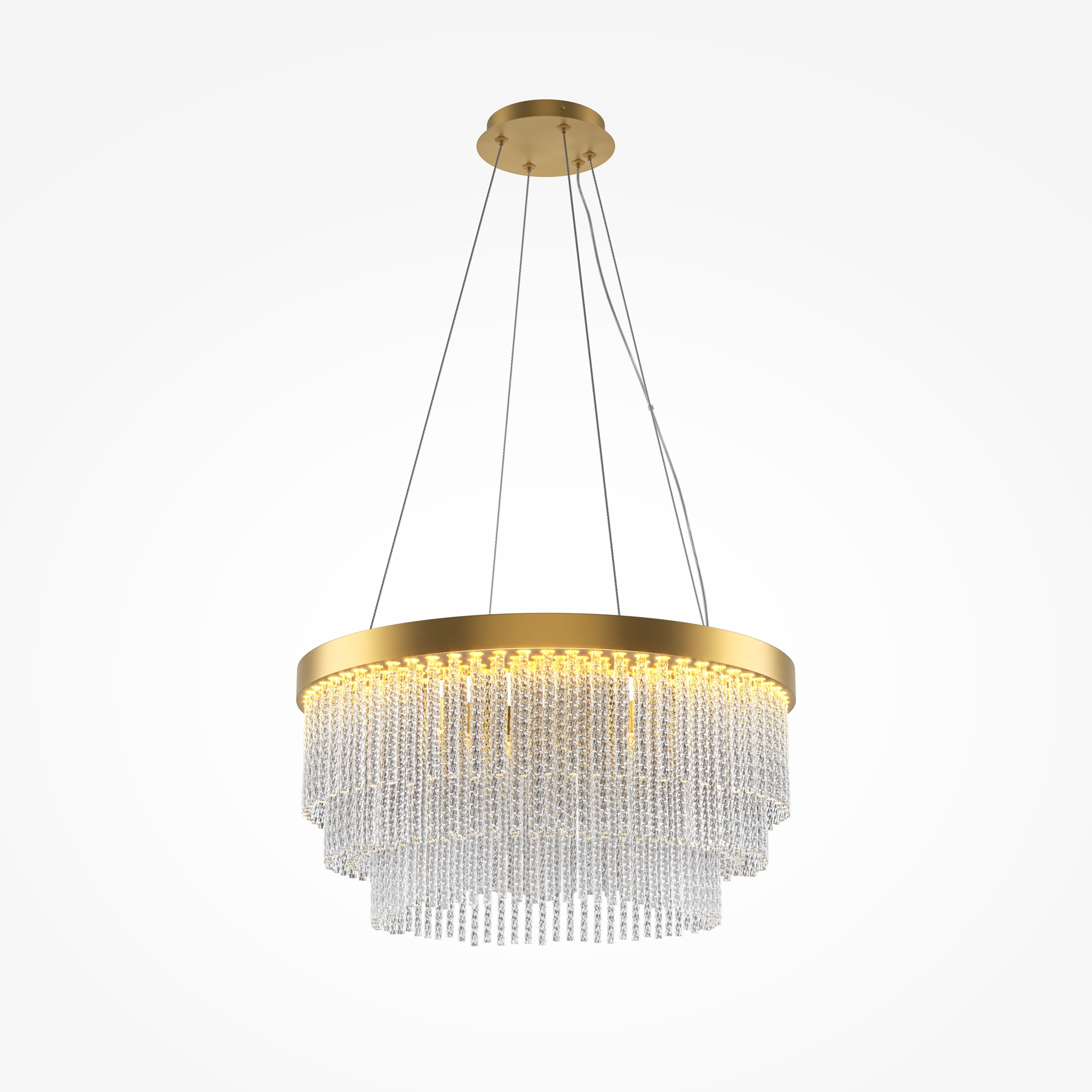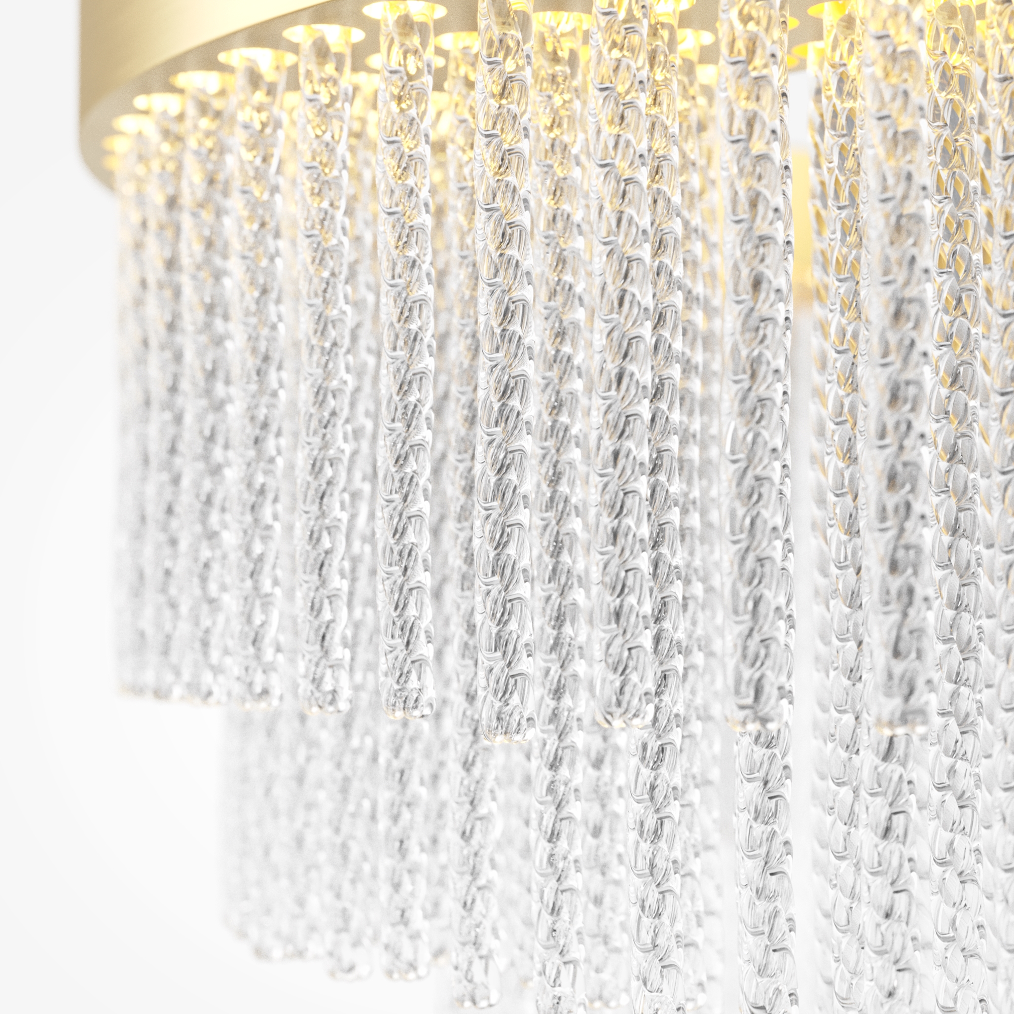 Арматура выполнена из металла в цвете латуни с легким мерцающим финишем. Декоративные элементы: стеклянные трубочки с витиеватым орнаментом, игриво переотражающим свет. Встроенный LED-источник, создающий свет достаточный для основного освещения. Трехступенчатый переключатель позволяет выбирать цветовую температуру: 2700K, 3000K или 4000K. Высота светильника регулируется, максимальная высота — 3300 мм. Высокий индекс цветопередачи CRI >90. Создает изысканное освещение с игрой бликов и переотражений.