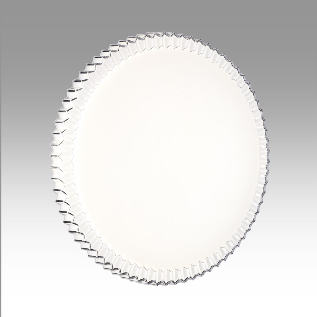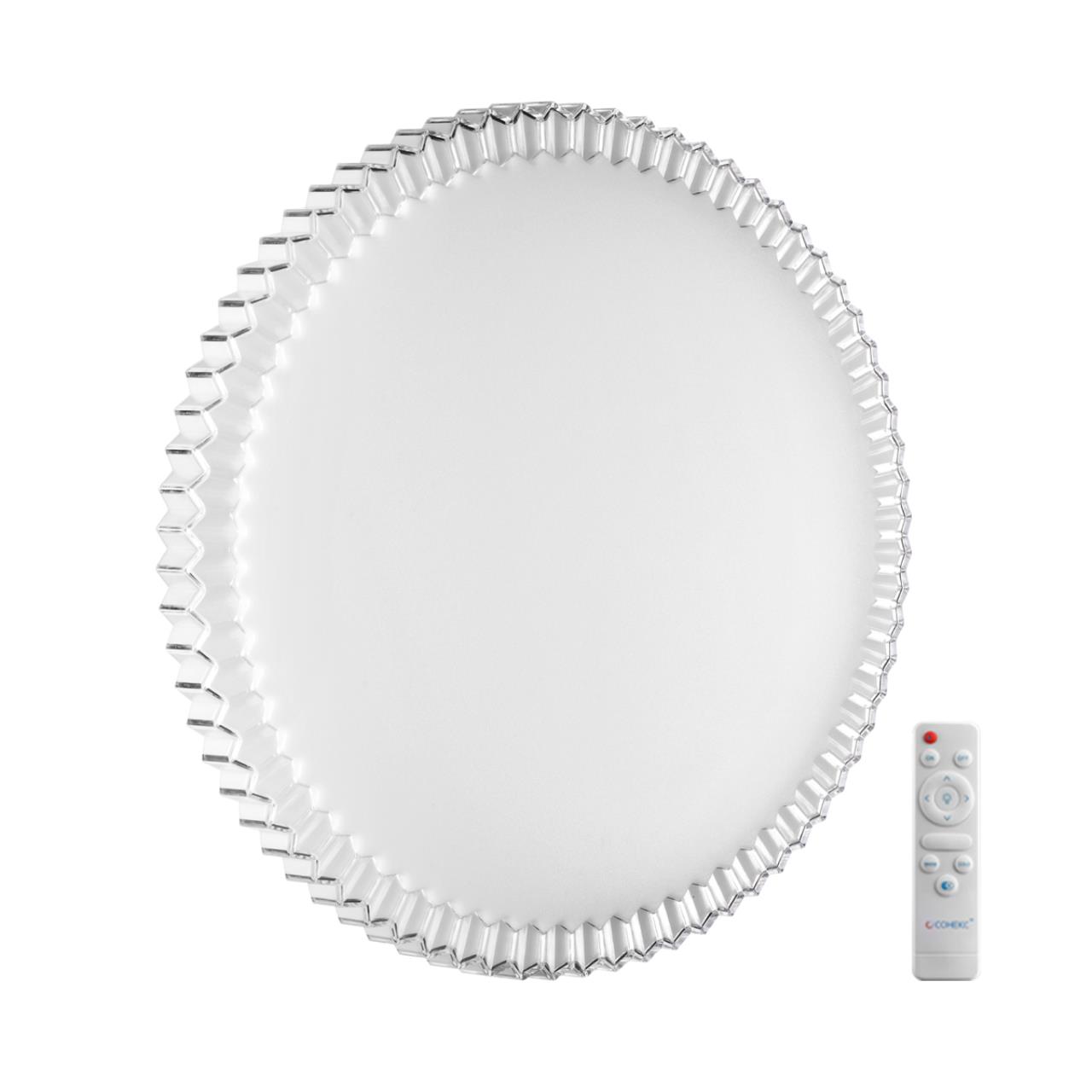 Светильник 7673/EL линии ATIKO состоит из металлического основания (базы) и пластикового рассеивателя. Материал рассеивателя — высококачественный пластик марки PMMA 2.0 белого цвета с гладкой матовой поверхностью, обеспечивающий светильнику равномерное рассеивание и хорошее светопропускание. Форма плафона: круглая, декорирована рельефным ободом из пластика прозрачного цвета. Степень защиты IP43 позволяет использовать светильник в определенных зонах влажных помещений. В комплект входит заменяемый LED-модуль с линзами мощностью 70 Вт, соответствующими лампе накаливания 610 Вт, а также пульт ДУ (с креплением на стену), с помощью которого осуществляется плавное изменение цветовой температуры в диапазоне 3000—6000 К, изменение яркости, переход в режим переключения теплого/белого/холодного/ночного света. Светильник имеет функцию памяти.